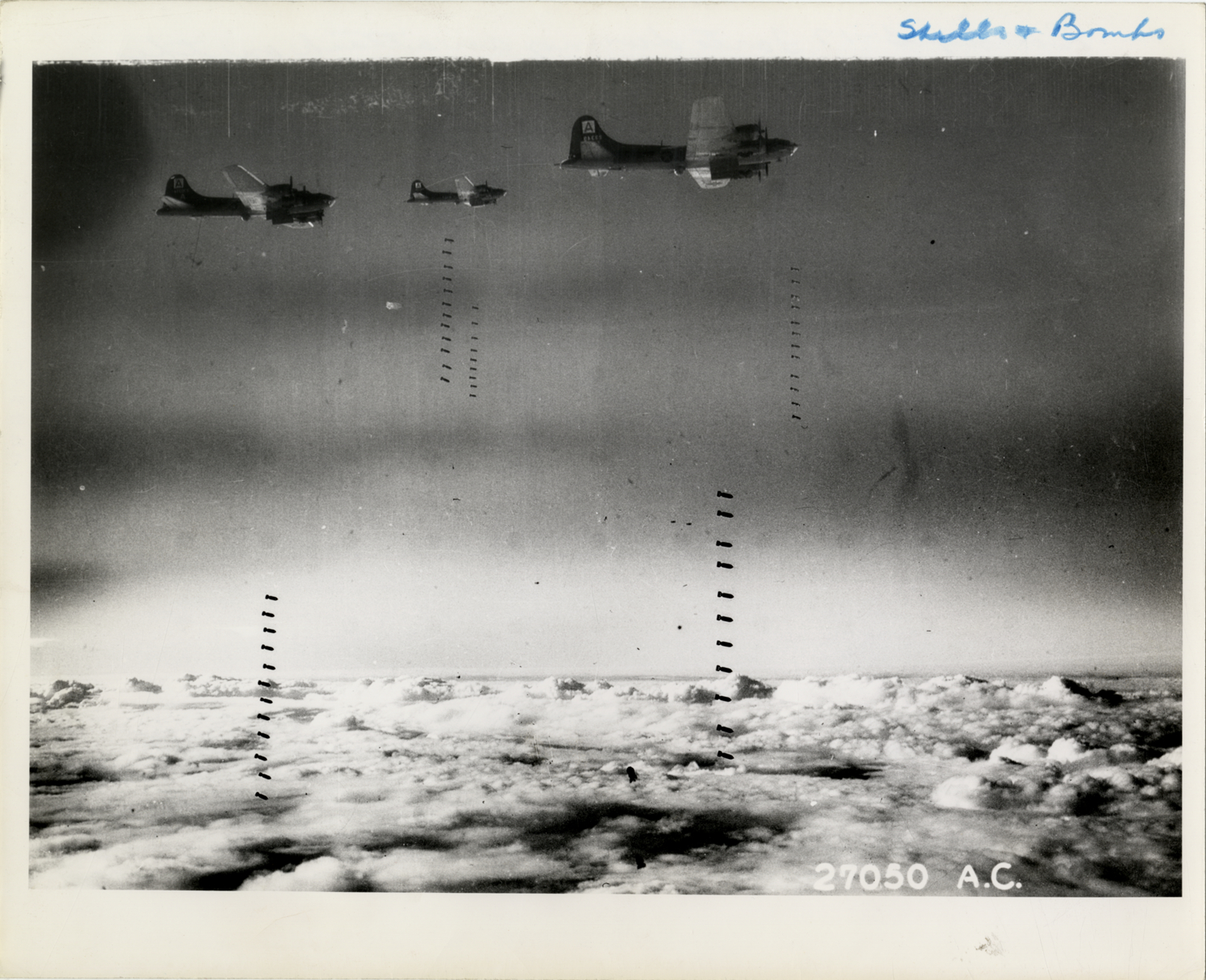 Ansicht von amerikanischen Boeing B-17 Bombern während eines Angriffs über Emden während des Zweiten Weltkriegs. Aufdruck auf der Rückseite: “Freigegeben für Publikation Kredit: Offizielles Foto U.S. Luftwaffe” Handgeschrieben auf Rückseite: “Boeing B-17 Forts während eines Angriffs auf Emden, 2. Okt. 43. – Flugzeug in Aktion.”